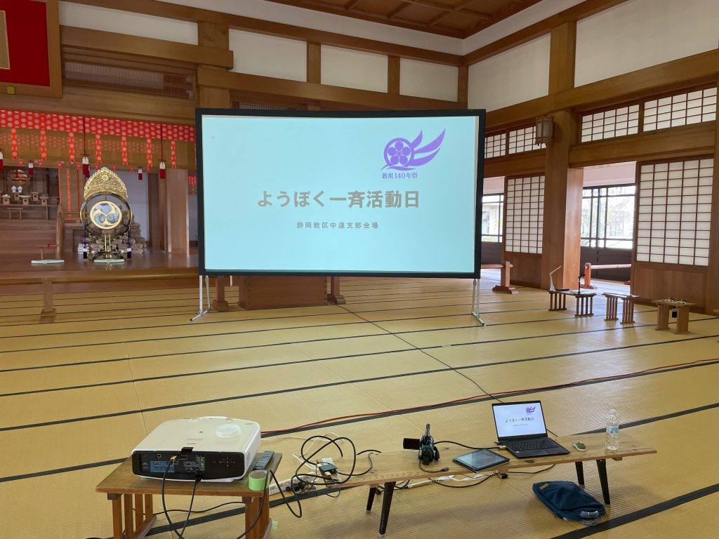 中遠支部では、山名大教会が会場となっています。本部のビデオメッセージの後、中遠支部内で活躍するようぼくのヒストリー動画を上映。その後、大茶会を開催しました。参加者250名